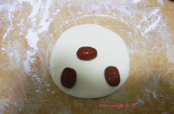 将圆面片的一端对折过来盖在红枣上,再在中间放一粒红枣;