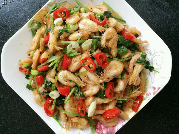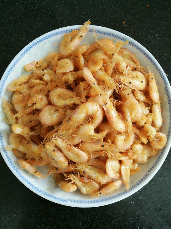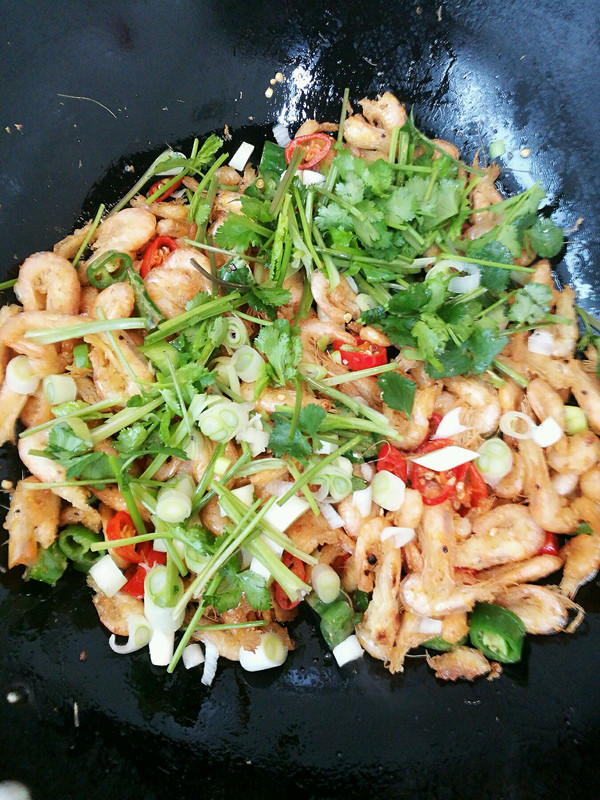 油锅热后,将小虾分两次倒入炸。炸的时候要不停的翻动,这样的炸虾火候均匀酥脆。由于操作不便的原因,没能拍照。如果不喜欢配料的朋友,这样吃也很美味,能品出虾的原汁原味。