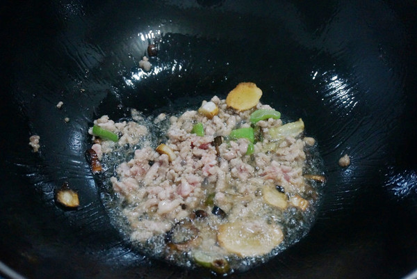 锅中放入适量油,油热放入姜片和葱花煸香。