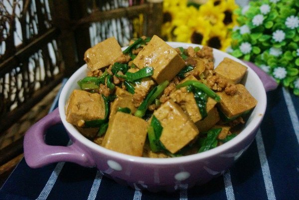 豆腐切成两厘米见方小块。放到锅中焯一下水,去除豆腥味,也能使豆腐不易碎。韭菜洗净切成段。