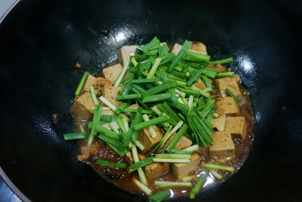 放入豆腐,先不要急着翻动,加入一小碗水,3勺酱油,2克盐,中小火慢炖至汤汁变少。