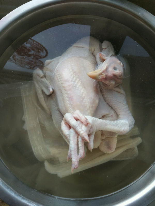 我买的是冷冻的三黄鸡所以要泡下热水解冻,然后剁碎,还有一起泡着的宽粉(我的最爱)