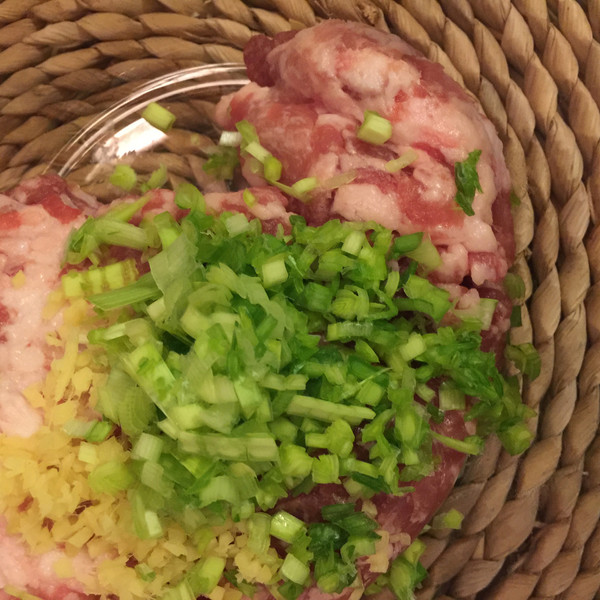 肉馅加入切碎的青蒜末姜末,加入盐3g 、十三香1勺 、蚝油1勺、酱油1勺、蔬之鲜1勺(这部分的调料勺为茶匙,1茶匙的调料重量大概2g左右)清水30ML顺时针搅拌直到水和肉馅完全融合,搅拌时觉得有点费力即可。
