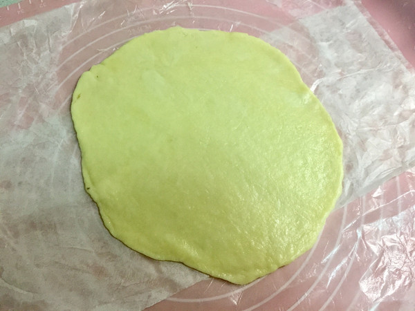 先把大的一个面团放油纸上,再盖一层油纸,擀成超出6寸圆盘一大圈的派皮