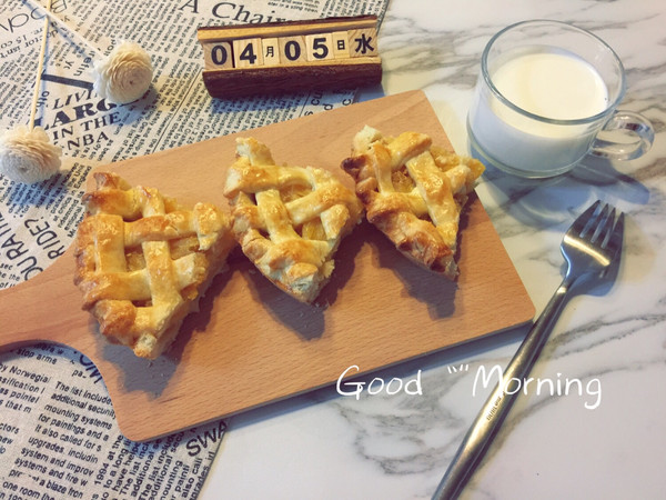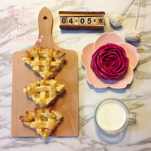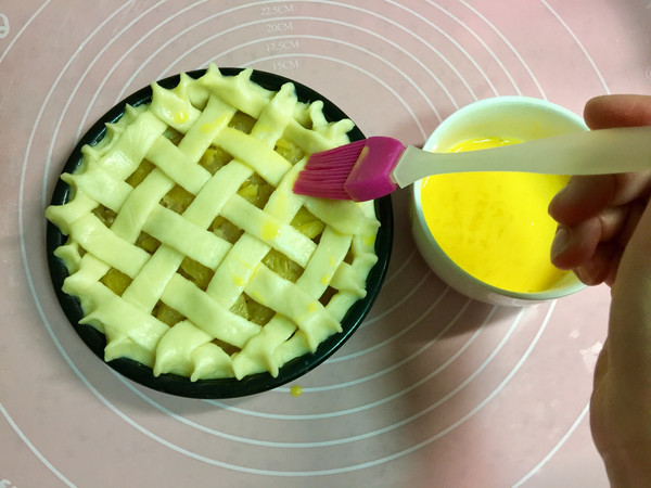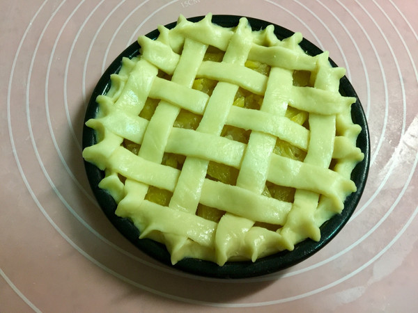 盘里盛进菠萝馅,把网格派皮连油纸一起倒扣在圆盘上,揭去油纸