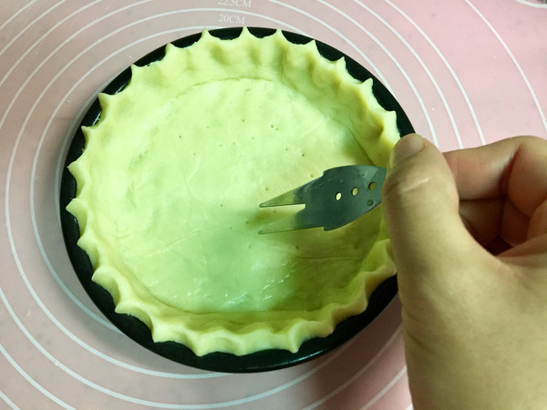 擀好的派皮盖在圆盘上,整理好,把多出的派皮剪掉,留出2cm左右,折回去