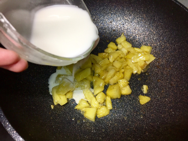 准备好材料,菠萝去掉中心硬的部分,其余切丁,放盐水里泡一会儿。