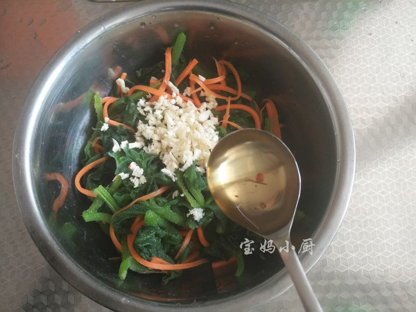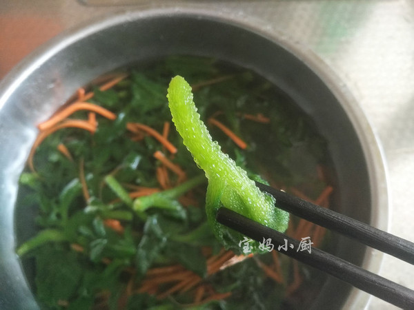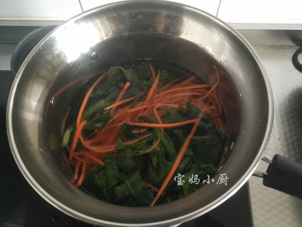 小锅里加水烧开后滴入几滴植物油,放入冰草和胡萝卜丝