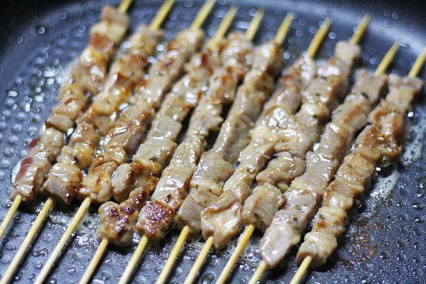 开中火,把羊肉串平放下去煎烤,中途翻面,煎至两边有点焦黄(大约煎个7分钟);