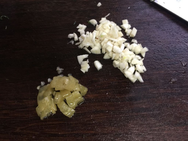 再把蒜末和泡椒丁放在最上面,把调好的糖醋汁淋上