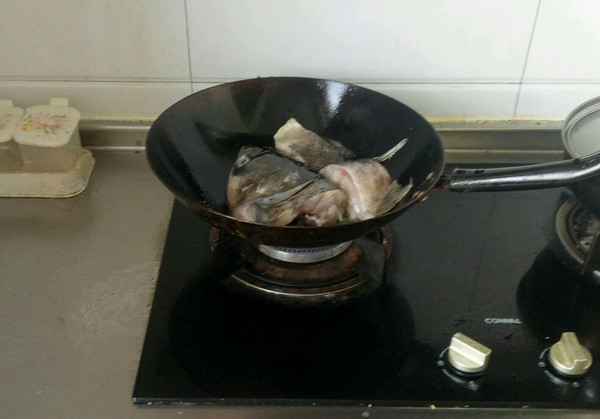 首先将鱼头放入锅中煎至微黄