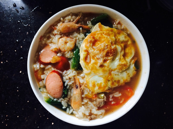 将一碗水,一碗饭,青菜加入的步骤二的材料中,然后煮沸腾就好啦! 味道好好的哟!