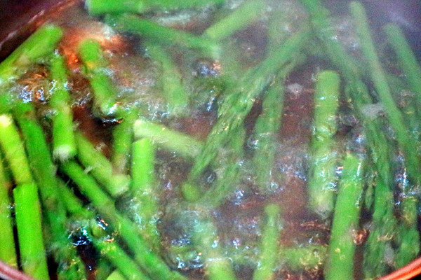 沸水撒少许盐,芦笋入锅烫两分钟捞出盛盘。