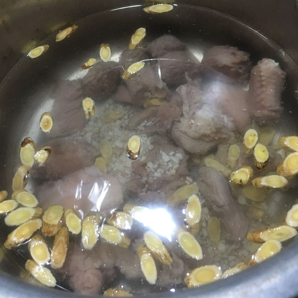 锅中加入足量的清水,放入鸭肉,加入薏米和黄芪。