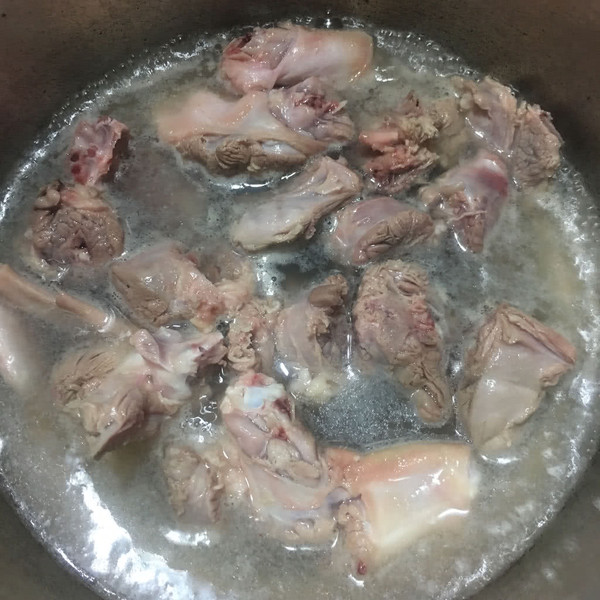 鸭肉焯水,洗净。