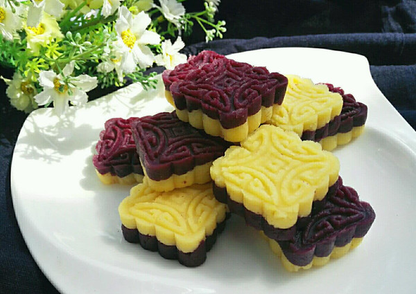 颜色艳丽,口感软糯甜香,紫薯的清甜口味中和了绿豆糕的甜腻,别有风味。
