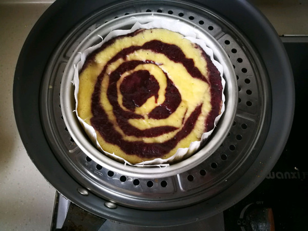 从小米面糊中央再舀入一勺黑米面糊,两种面糊交替舀入到模具中。