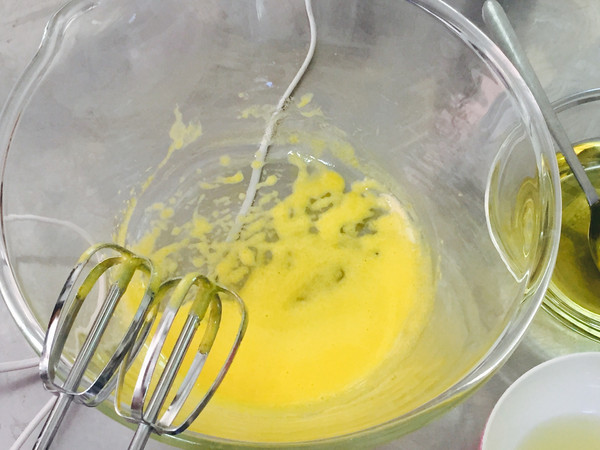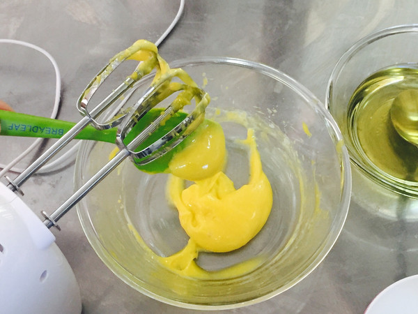 打发蛋黄至颜色变浅、体积稍膨胀、细腻浓稠状态。