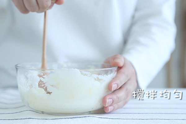 PS:蛋清不要一次性加一个,要看搅拌性状而定。刚开始只加辅食勺的一勺就可以了,根据情况再考虑是不是再加,只要如上图性状了就说明可以了。