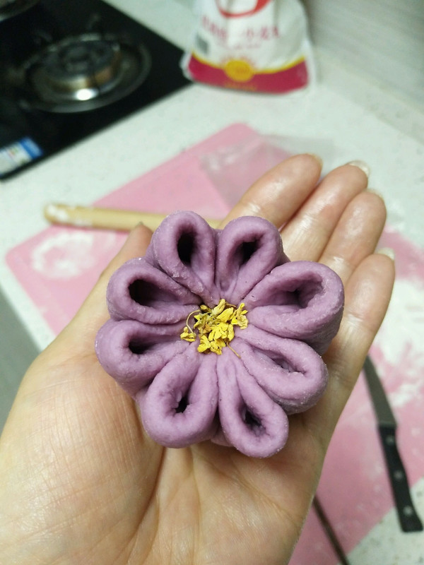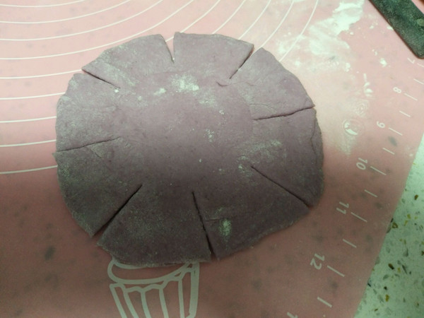 酵母和糖加入37℃温开水化开缓缓倒入面粉揉成面团,(为了颜色好看我加入了一点紫薯粉),盖上保鲜膜发酵至两倍大。