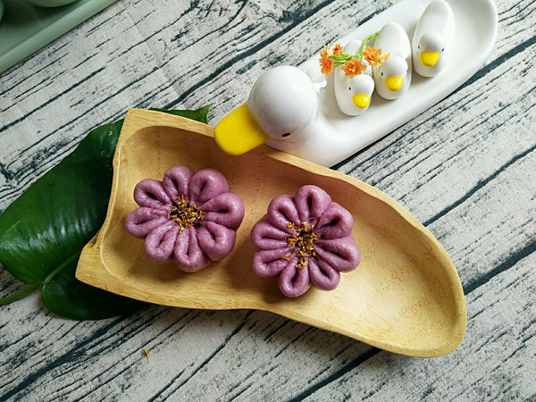 紫薯馅的做法:紫薯去皮蒸熟用叉子压成泥,加入炼乳和蜜豆,搓成圆球备用