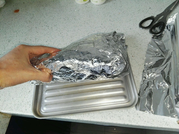 步骤5的羊腿放在蔬菜上用锡纸包裹好,多包几层,包严实一点。