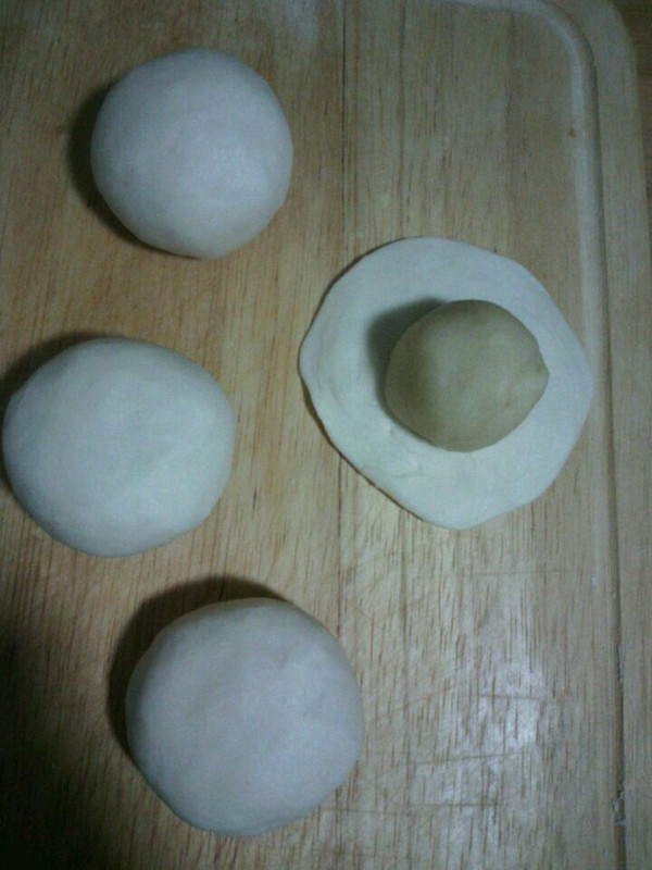 50克面粉加适量的水,50克面粉加适量的油,活成两个光滑的面团