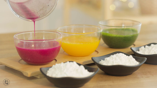 面粉分成3份(50克一份),将面粉分别倒入果蔬汁中。