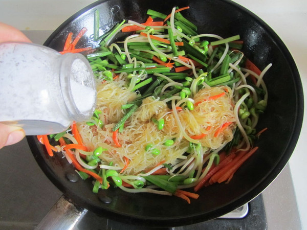 韭菜微微变色后加入适量的盐调味, 翻炒均匀,盛入盘中。
