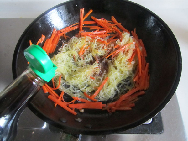热锅凉油, 放入胡萝卜丝进去煸炒;