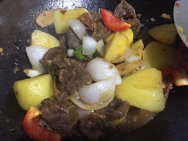 然后把切好的土豆放进锅里很敷衍的炒两下,加水,煮开,把牛肉放进来,让她们在一起,然后加入洋葱青椒红椒,如果喜欢吃脆一点的可以要收汁前加。大火烧开!收汁!!!