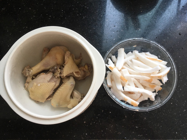 鸡肉冷了 放入椰肉 加水(切记哦 一定等鸡肉冷了在加水 烫的鸡肉遇见冷水。会热胀冷缩 影响口感)