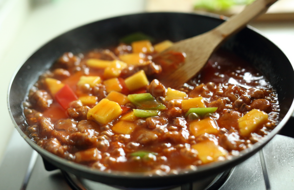 锅中加少许油,放姜、蒜爆香。倒入炸好的肉块、菠萝块、青红椒大火快炒,加入调味汁翻炒至其均匀裹食材上,撒香菜碎即可。调味汁中因加入了番茄酱,使得口感更佳顺滑美味,酸甜适口。