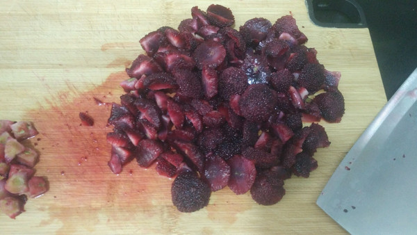 杨梅粒放入不粘锅,加柠檬汁,糖