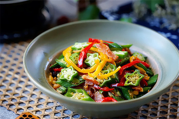 倒入秋葵翻炒半分钟,不要炒的时间过长