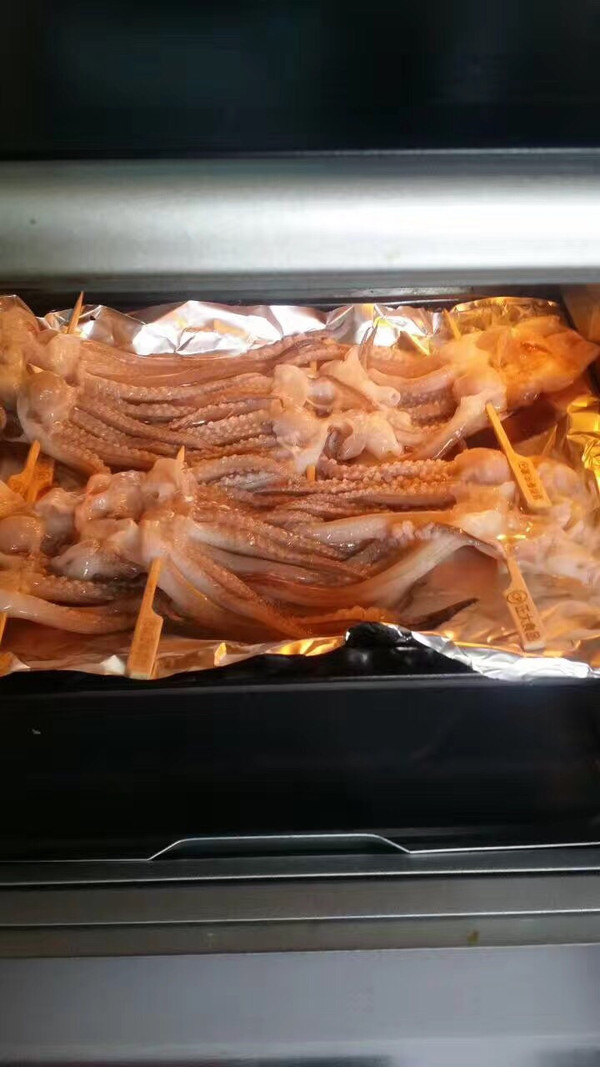 鱿鱼头放烤箱中层二百度二十分钟,中途翻面,喜欢火大的可以再加二百二十度十分