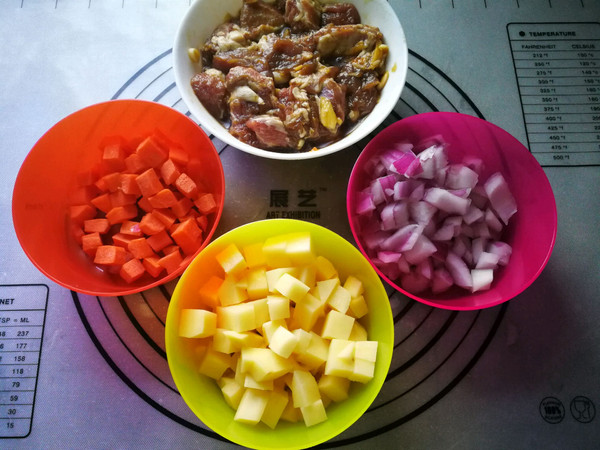 排骨洗净去血水,加入蒜片蚝油生抽料酒腌制,土豆洋葱胡萝卜切丁