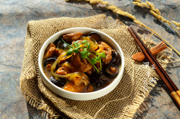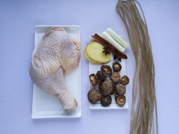 准备好食材:鸡腿1只、香菇20朵、粉条100克、大葱2段、生姜3片、桂皮1块、八角2个;