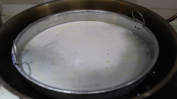一点点抓面水变白,第一次抓到一定的浓度把面水倒入其他干净的盆子中