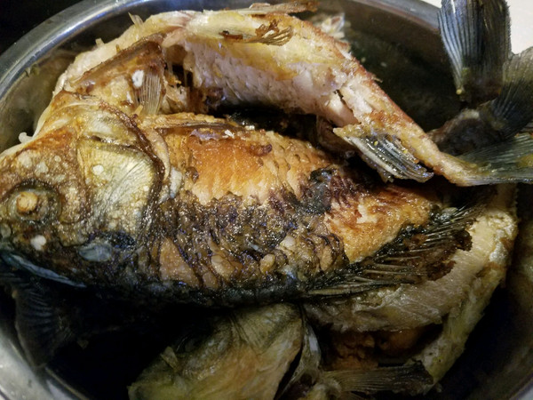 放少许油,中火,待油热之后,把清理干净的鲫鱼放入锅内,炸至两面焦黄。这个看个人而言,我喜欢炸的比较久比较香