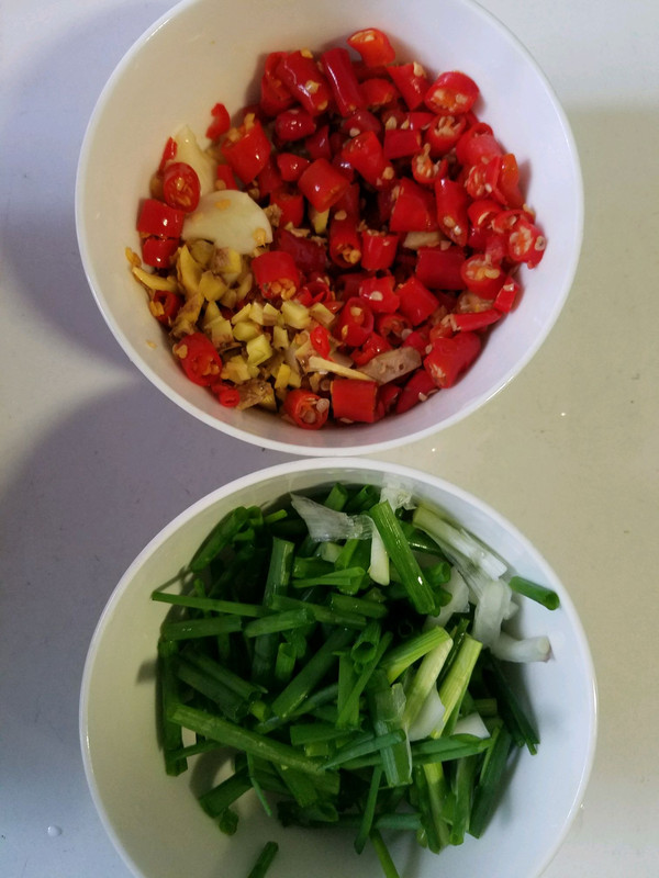 准备好配料,泡脚,小米辣,姜,蒜,小葱切断