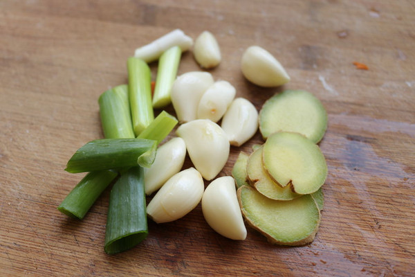 准备大蒜头,葱段和姜片。