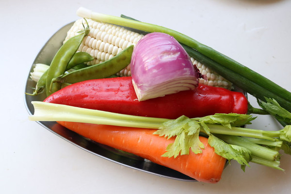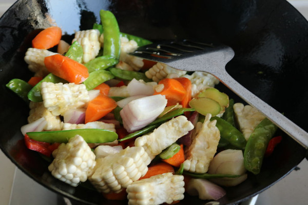 下入蔬菜,这一步炒的有胡萝卜,部分荷兰豆,圆葱和玉米。