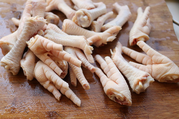 鸡爪剪去指甲,剁成两半。