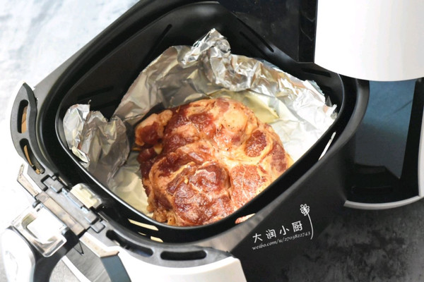 ④空气炸锅中垫锡纸,将腌好的肉捞起放进空气炸锅中,蜜汁不要倒,