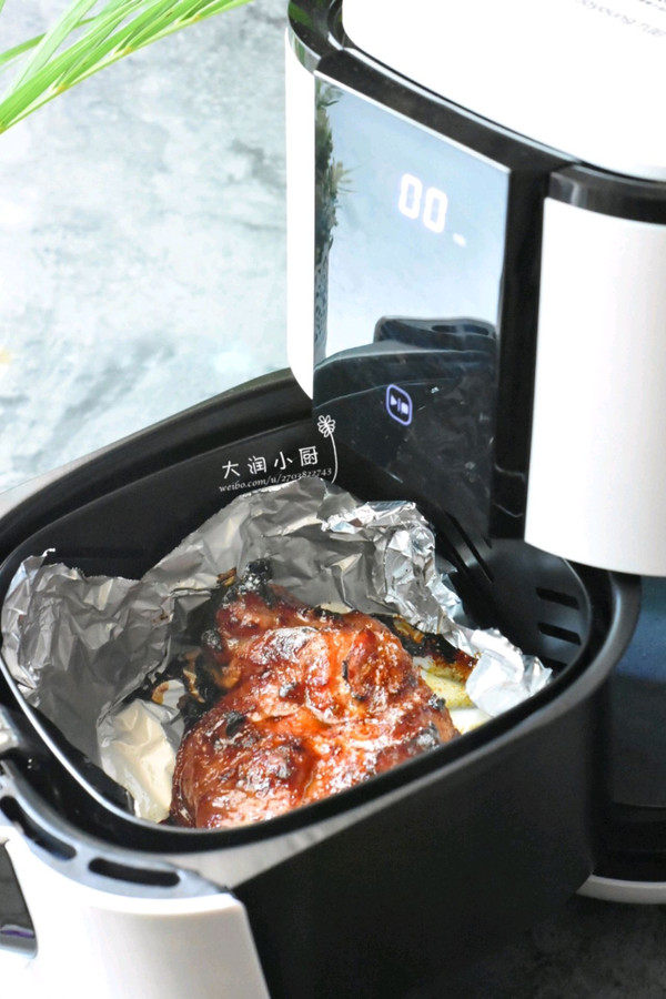 ⑤设置200度烤35分钟,烘烤15分钟时,拖出炸篮,翻面,将第④步中的蜜汁给肉刷一层,炸篮推回继续烤,