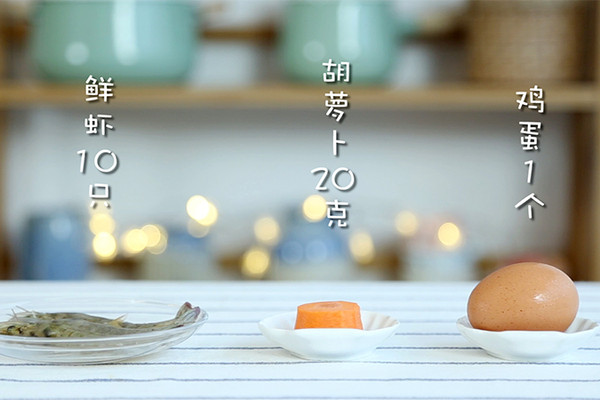 胡萝卜和鲜虾一起放入辅食机中搅打细腻。 PS:这一步可不要加水搅拌哦,否则虾泥太稀会粘合不住的。