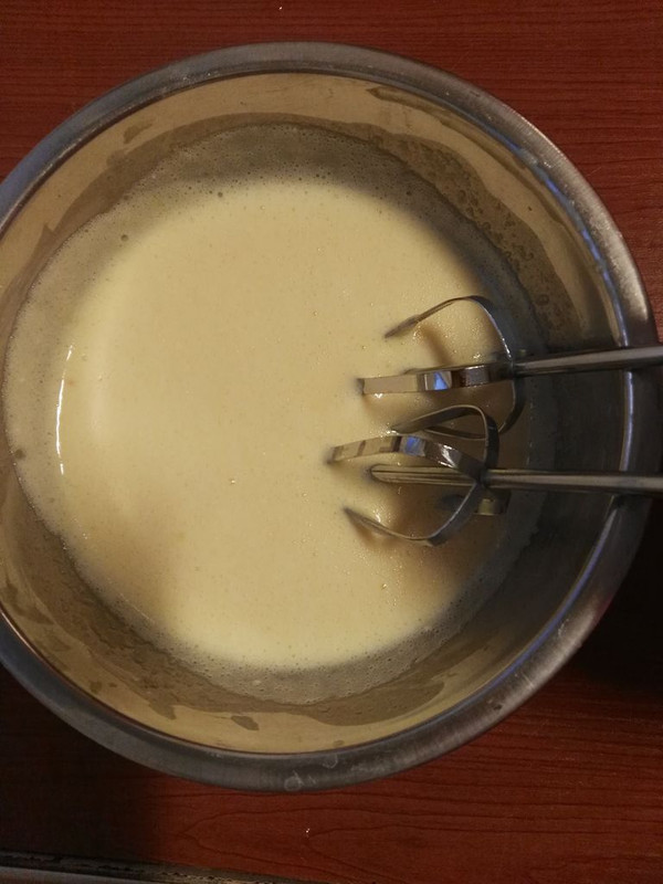 将混合液体用电动打蛋器搅打4分钟左右,放入冰箱冷冻2小时以上