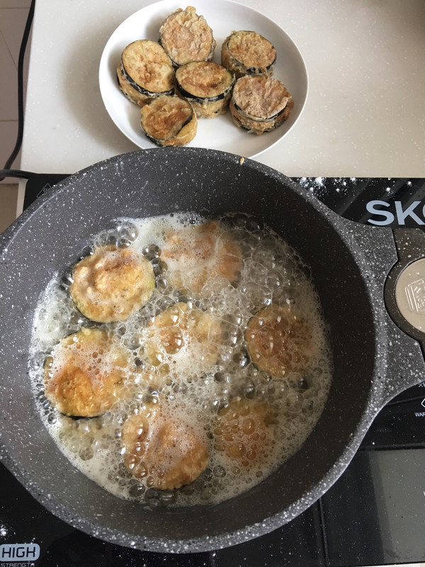 锅中倒入适量油,开启中火预热。放入茄盒转中小火炸制,将茄盒炸熟,且两面金黄捞出。