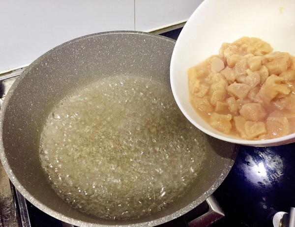 水沸腾,放料酒,焯鸡丁,鸡丁变白色,水沸腾捞出,用凉水冲洗下,沥干备用。